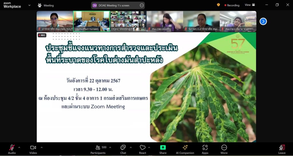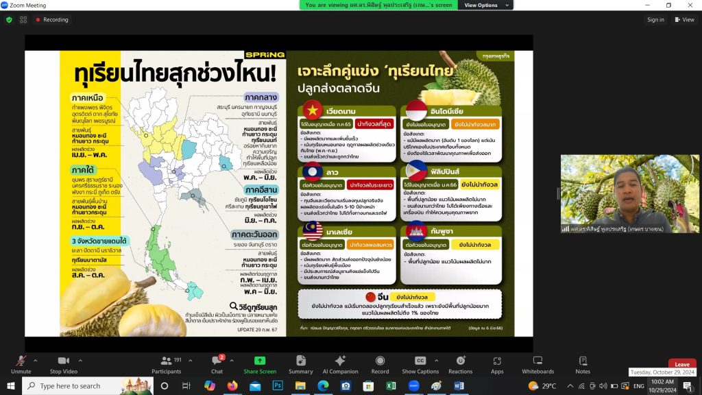 ****************** วันที่ 19 พฤศจิกายน 2567 นางพรทิพย์ ศรีสมโภชน์ เกษตรจังหวัดชลบุรี มอบหมายให้นางสุวิสาส์ กันตอนันตพร หัวหน้ากลุ่มอารักขาพืช และเจ้าหน้าที่ กลุ่มอารักขาพืช ร่วมประชุมชี้แจงโครงการส่งเสริมการจัดการสุขภาพพืชเพื่อเพิ่มประสิทธิภาพการผลิตสินค้าเกษตร ปีงบประมาณ พ.ศ. 2568 ผ่านระบบออนไลน์ Zoom meeting ณ ห้องประชุมศูนย์ปฏิบัติการ ชั้น 2 อาคาร 1 กรมส่งเสริมการเกษตร โดยมีนายพีรพันธ์ คอทอง อธิบดีกรมส่งเสริมการเกษตร เป็นประธานการประชุม โดยที่ประชุมชี้แจงการดำเนินงานโครงการส่งเสริมการจัดการสุขภาพพืชเพื่อเพิ่มประสิทธิภาพการผลิตสินค้าเกษตร ปีงบประมาณ พ.ศ. 2568 1. กิจกรรมส่งเสริมการจัดการสุขภาพพืชเพื่อความปลอดภัยของสินค้าเกษตร 2. กิจกรรมเฝ้าระวังการระบาดของศัตรูพืชเชิงรุกและการแจ้งเตือน 3. ควบคุม ป้องกัน และเตรียมความพร้อมรับมือสถานการณ์การระบาดศัตรูพืช 4. พัฒนาเครือข่ายความรู้และบริการด้านการจัดการสุขภาพพืช