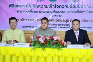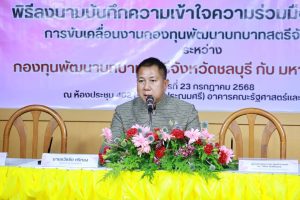 วันที่ 23 กรกฎาคม 2568 นางพรทิพย์ ศรีสมโภชน์ เกษตรจังหวัดชลบุรี เข้าร่วมพิธีลงนามบันทึกความเข้าใจ (MOU) เพื่อขับเคลื่อนกองทุนพัฒนาบทบาทสตรีร่วมกับมหาวิทยาลัยบูรพา ณ ห้องประชุมชนะ ประณมศรี ชั้น 4 อาคารคณะรัฐศาสตร์และนิติศาสตร์ มหาวิทยาลัยบูรพา อำเภอเมืองชลบุรี โดยมีนายธวัชชัย ศรีทอง ผู้ว่าราชการจังหวัดชลบุรี เป็นประธานในพิธี