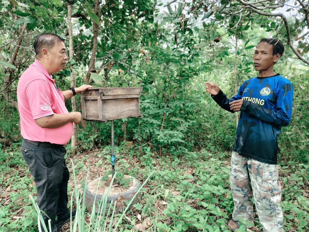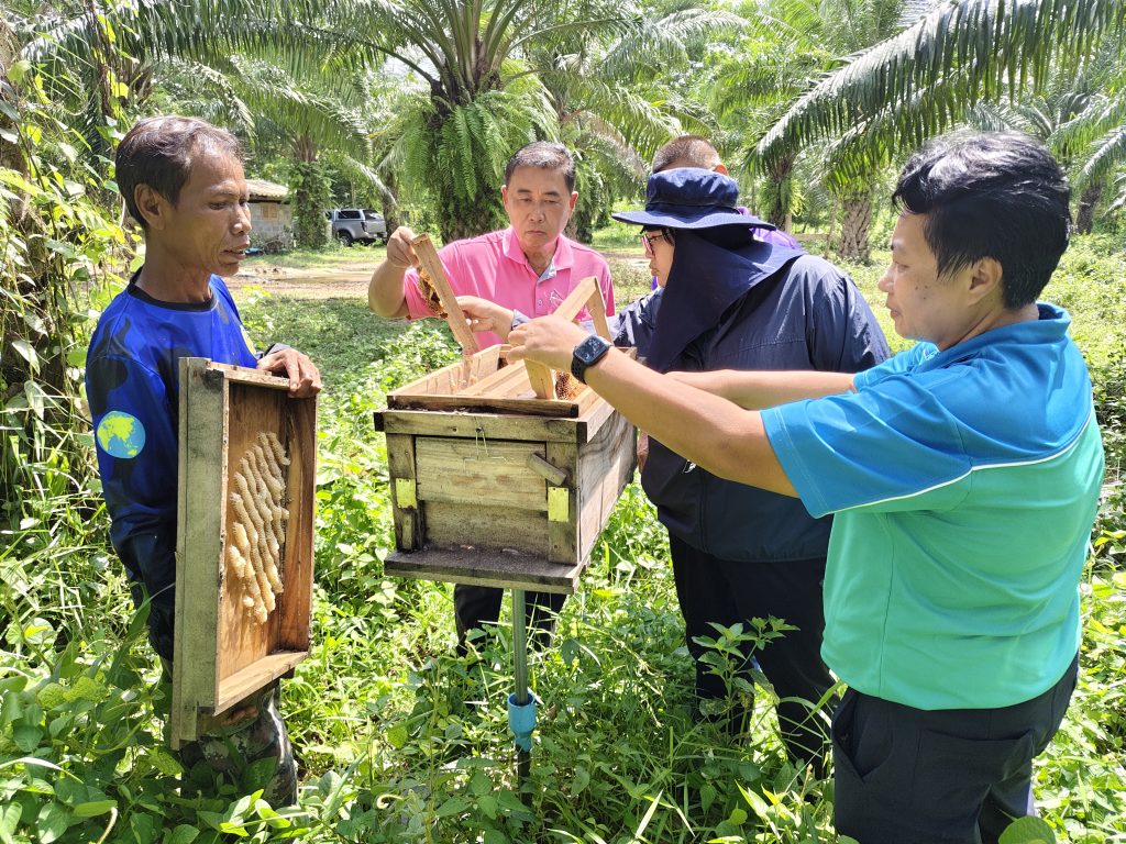 ช่วงบ่ายวันเดียวกันนี้ ได้ติดตามแปลงต้นแบบการเลี้ยงผึ้งโพรงในสวนปาล์มน้ำมัน พบว่า ผลผลิตปาล์มน้ำมันมีความสมบูรณ์มากขึ้น และได้ผลผลิตเพิ่มขึ้นเมื่อเทียบกับปีที่ผ่านมา นอกจากนี้ยังมีผลผลิตพลอยได้จากการเลี้ยงผึ้งโพรง คือน้ำผึ้ง ซึ่งเกษตรกรสามารถนำมาจำหน่ายสร้างรายได้อีกทางหนึ่งด้วย ทั้งนี้ การเลี้ยงผึ้งโพรงในแปลงปาล์มน้ำมัน เป็นหนึ่งในแนวทางการทำการเกษตรแบบฟื้นฟู (Regenerative Agriculture)