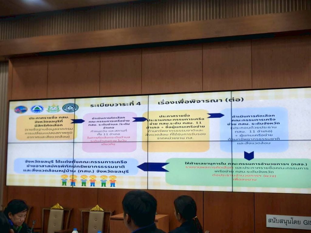 และร่วมกันพิจารณา แนวทาง ขั้นตอนการคัดเลือก คณะกรรมการเครือข่ายอาสาสมัครพิทักษ์ทรัพยากรธรรมชาติและสิ่งแวดล้อมหมู่บ้าน (ทสม.) จังหวัดชลบุรี และมติที่ประชุมเห็นชอบตามแนวทางคือ การประกาศรายชื่อเครือข่าย ทสม.ชลบุรี ที่มีสิทธิคัดเลือก คัดเลือกคณะกรรมการเครือข่าย ทสม. ระดับตำบล/อำเภอ ทั้ง 11 อำเภอ การประกาศรายชื่อคณะกรรมการเครือข่าย ทสม. ที่ได้รับการรับรองจากหน่วยงาน ทส. ทั้ง 11 อำเภอ การดำเนินการคัดเลือกคณะกรรมการเครือข่าย ทสม. ทั้ง 11 อำเภอ การรายงานผลการคัดเลือกและประกาศรายชื่อคณะกรรมการฯ ให้ประธานทราบ และการดำเนินการแต่งตั้งคณะกรรมการเครือข่าย ทสม. จังหวัดชลบุรี