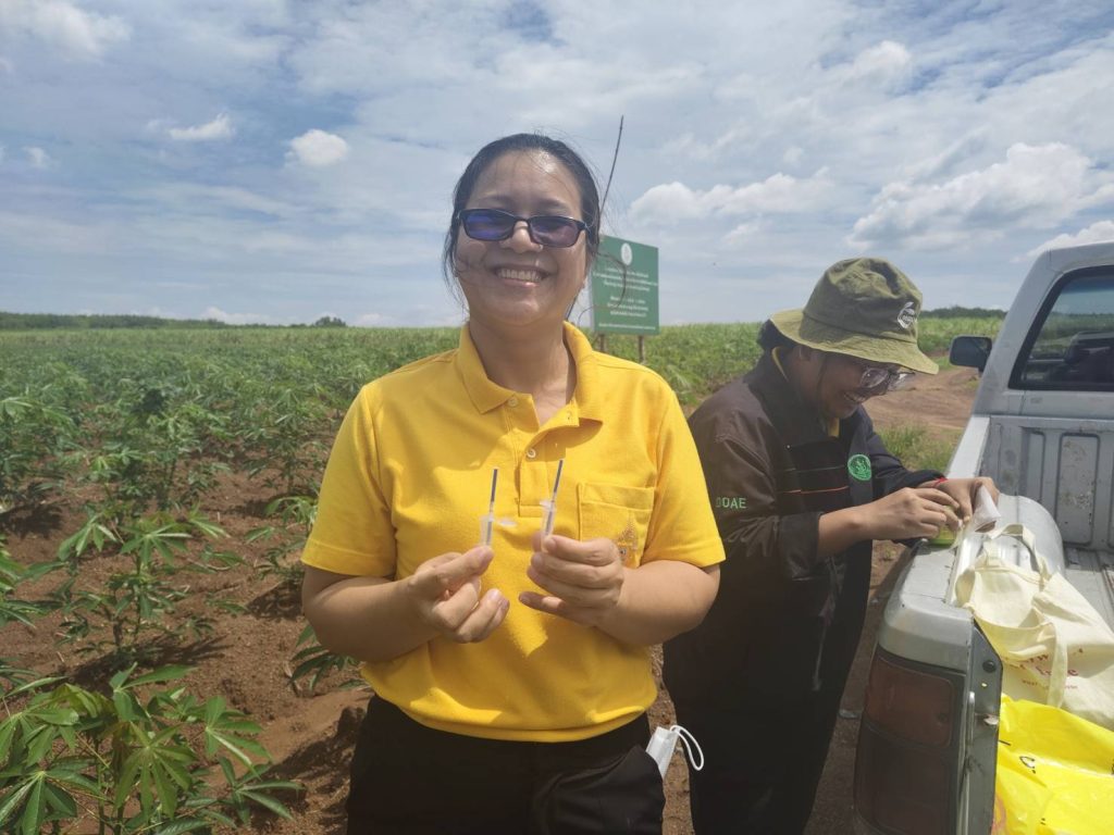 โดยการสำรวจโรคใบด่างมันสำปะหลังเมื่อมีอายุ 3 เดือน และใช้ชุดตรวจ SLCMV Strip Test เป็นชุดตรวจหาเชื้อ _Sri Lankan cassava mosaic virus_ (SLCMV) ซึ่งเป็นสาเหตุของโรคใบด่างมันสำหลัง