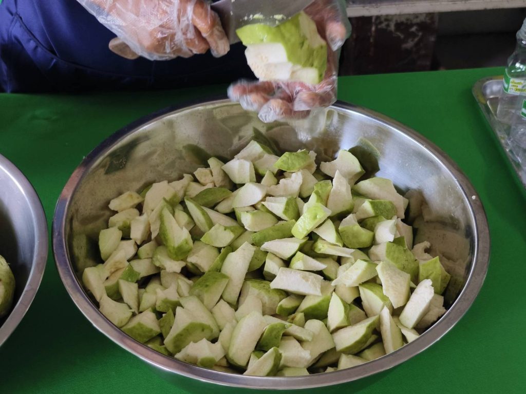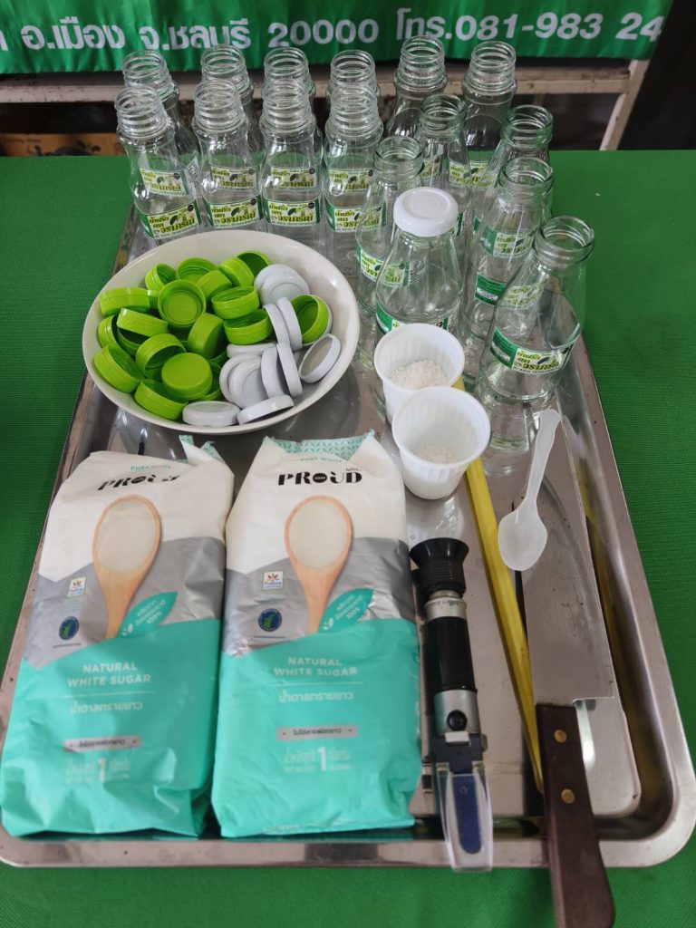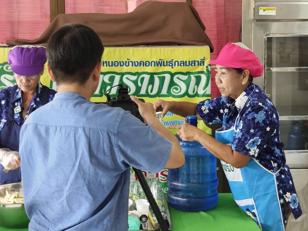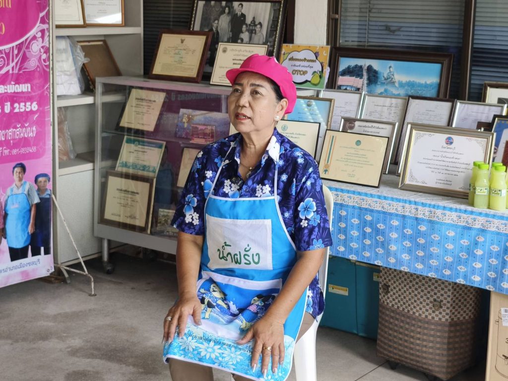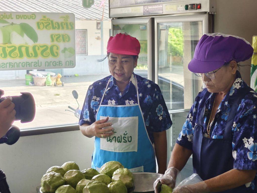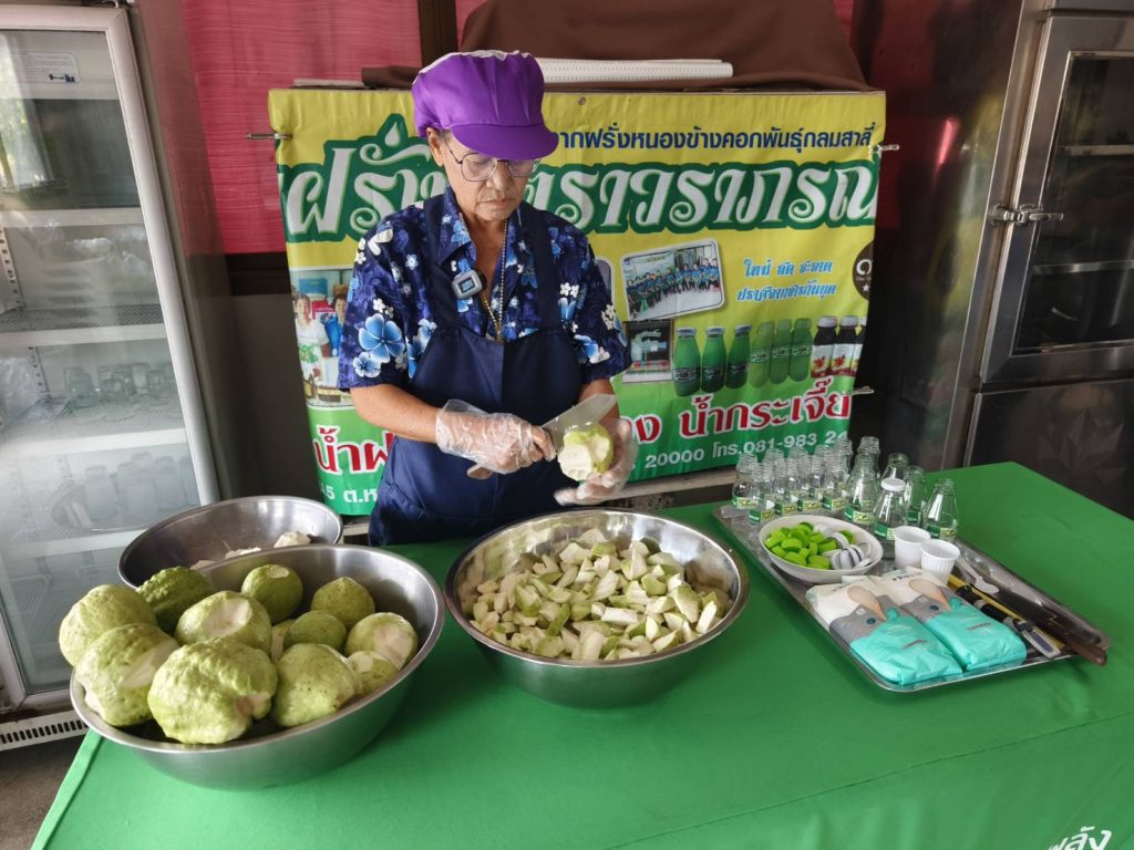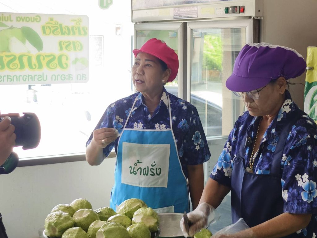 นางวราภรณ์ แจ้งเจริญ ประธานกลุ่มแม่บ้านเกษตรกรสตรีพัฒนาผาสุกสัมพันธ์ พร้อมด้วยสมาชิกกลุ่ม ได้สาธิตขั้นตอนการทำน้ำฝรั่งสดหนองข้างคอก ตรา วราภรณ์ และได้ให้ข้อมูลความเป็นมาของการทำ “น้ำฝรั่งสดหนองข้างคอก ตรา วราภรณ์” การดำเนินงานของกลุ่ม และการขอรับรองมาตรฐานผลิตภัณฑ์