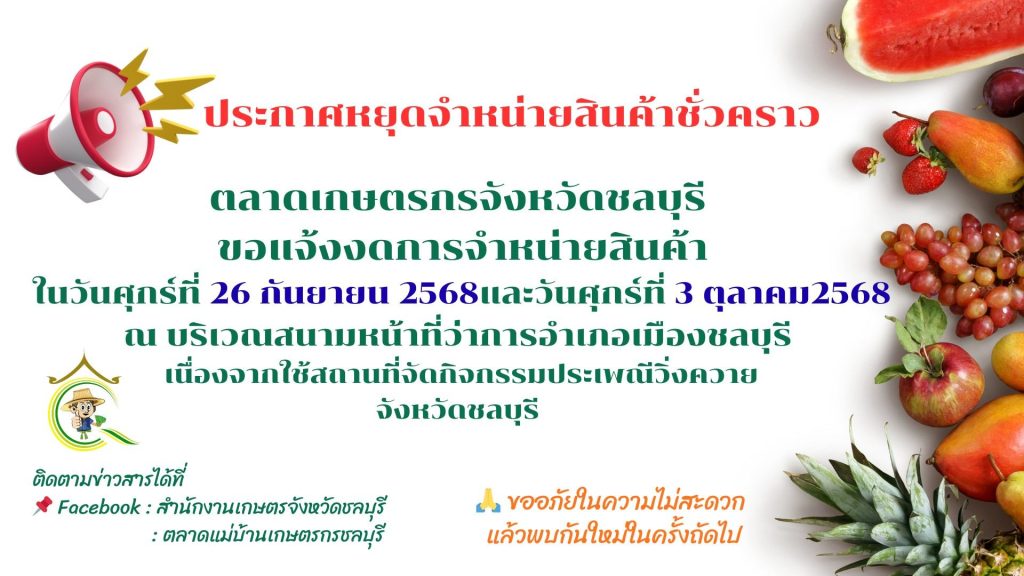 งดการจำหน่ายสินค้า ในวันศุกร์ที่ 26 กันยายน 2568 และวันศุกร์ที่ 3 ตุลาคม 2568 เนื่องจากใช้สถานที่จัดกิจกรรมประเพณีวิ่งควาย จังหวัดชลบุรี