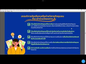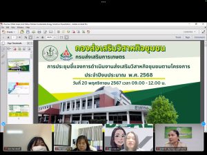 วันที่ 20 พฤศจิกายน 2567 นางพรทิพย์ ศรีสมโภชน์ เกษตรจังหวัดชลบุรี มอบหมายให้ นางสาวณัฐธิดา สหะวงศ์วัฒนา นักวิชาการส่งเสริมการเกษตรปฏิบัติการ กลุ่มส่งเสริมและพัฒนาเกษตรกร ร่วมประชุมชี้แจงการดำเนินงานส่งเสริมวิสาหกิจชุมชนตามโครงการ ประจำปีงบประมาณ พ.ศ. 2568 เวลา 09.00 – 12.00 น. ผ่านระบบออนไลน์ Zoom Meeting โดยมีนางวชิรา ไฝเจริญมงคล ผู้อำนวยการกองส่งเสริมวิสาหกิจชุมชน เป็นประธานการประชุม