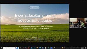นางพรทิพย์ ศรีสมโภชน์ เกษตรจังหวัดชลบุรี มอบหมายให้นายพุทธินันท์ บูรณะ นักวิชาการส่งเสริมการเกษตรชำนาญการ กลุ่มอารักขาพืชเกษตรชล เข้าร่วมประชุมชี้แจงการใช้งานระบบบันทึกกิจกรรม และคำนวณการปลดปล่อยก๊าซเรือนกระจก (Green House Gas System : GHGs) และติดตามความก้าวหน้าการดำเนินงานโครงการส่งเสริมการเกษตรที่เป็นมิตรกับสิ่งแวดล้อม ครั้งที่ 1 ผ่านระบบ Zoom Meeting โดยมีนายพีรพันธ์ คอทอง อธิบดีกรมส่งเสริมการเกษตรเป็นประธานการประชุม