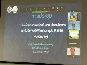 วันที่ 9 มิถุนายน 2568 นางพรทิพย์ ศรีสมโภชน์ เกษตรจังหวัดชลบุรี เป็นประธานการประชุมการเตรียมความพร้อมในการบริหารจัดการและรับมือภัยพิบัติในช่วงฤดูฝนปี 2568 จังหวัดชลบุรี โดยมีนางสาววราภรณ์ เฮงไล้ หัวหน้ากลุ่มส่งเสริมและพัฒนาเกษตรกร เกษตรอำเภอ และเจ้าหน้าที่ที่เกี่ยวข้องเข้าร่วมประชุม ผ่านระบบออนไลน์ zoom meeting ณ ห้องประชุมสำนักงานเกษตรจังหวัดชลบุรี